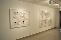 ...Os trabalhos que agora são apresentados partem de duas pesquisas do artista. A primeira é com jornais. Ali ele trabalha a retirada de textos por meio de recortes, deixando apenas o grid de diagramação. Sanvoy entende o jornal como signo do que é trabalhado na sociedade. “O jornal carrega uma carga de significado muito grande. E quando estou trabalhando com ele retirando essas informações, estou manipulando um signo, não o material em si. É um jogo de manipulação e de espaços vazados”. A outra é a das marcações de leituras de livros. Essas marcações passam para o papel vegetal. “O livro está sujeito à questão do tempo linear. É uma página após a outra, uma palavra após a outra. O papel vegetal possibilitava ver várias camadas de páginas em uma mesma superfície”. Além de permitir um jogo de provocação de esvaziamento do olhar, cria novas camadas de visão.